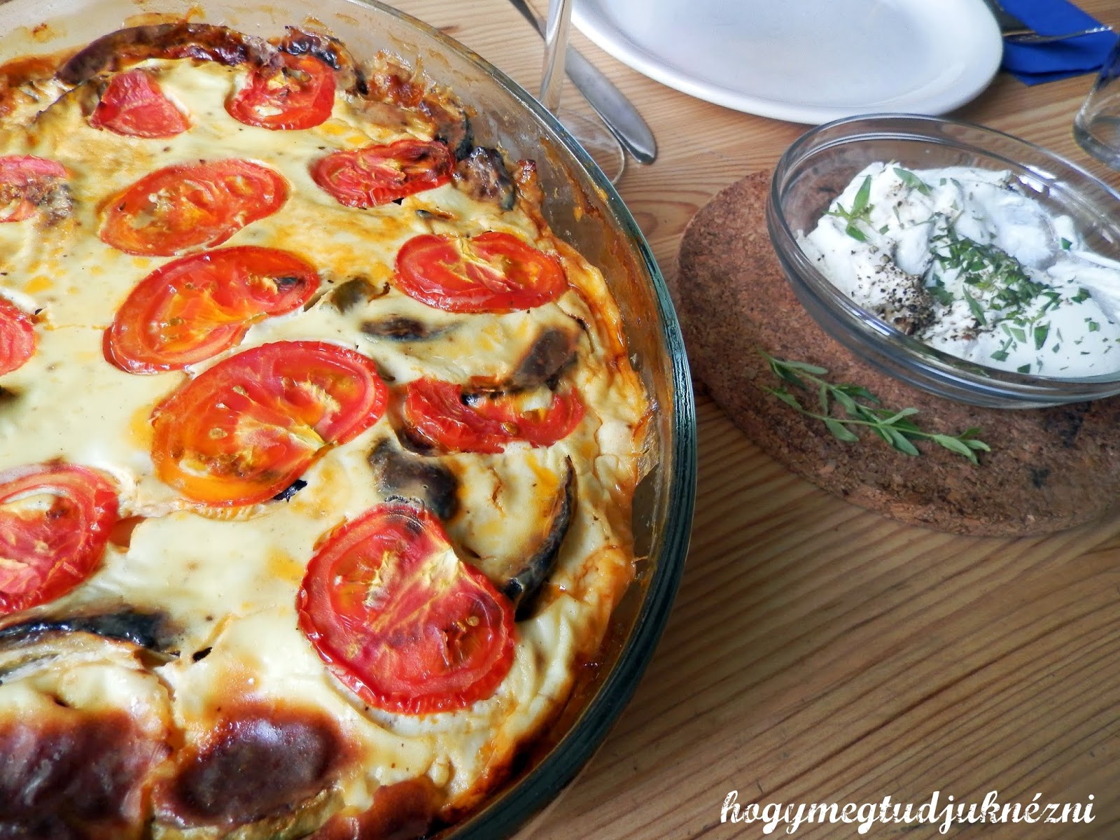 Az eredeti recept szerint besamellt ír a tetejére, de szerintem teljesen jó akár joghurt, akár tejföl. Én ezúttal sovány tejfölbe kevertem tojást és sót, azzal fedtem le. Úgy éreztem, kíván pár paradicsomszeletet is a teteje.